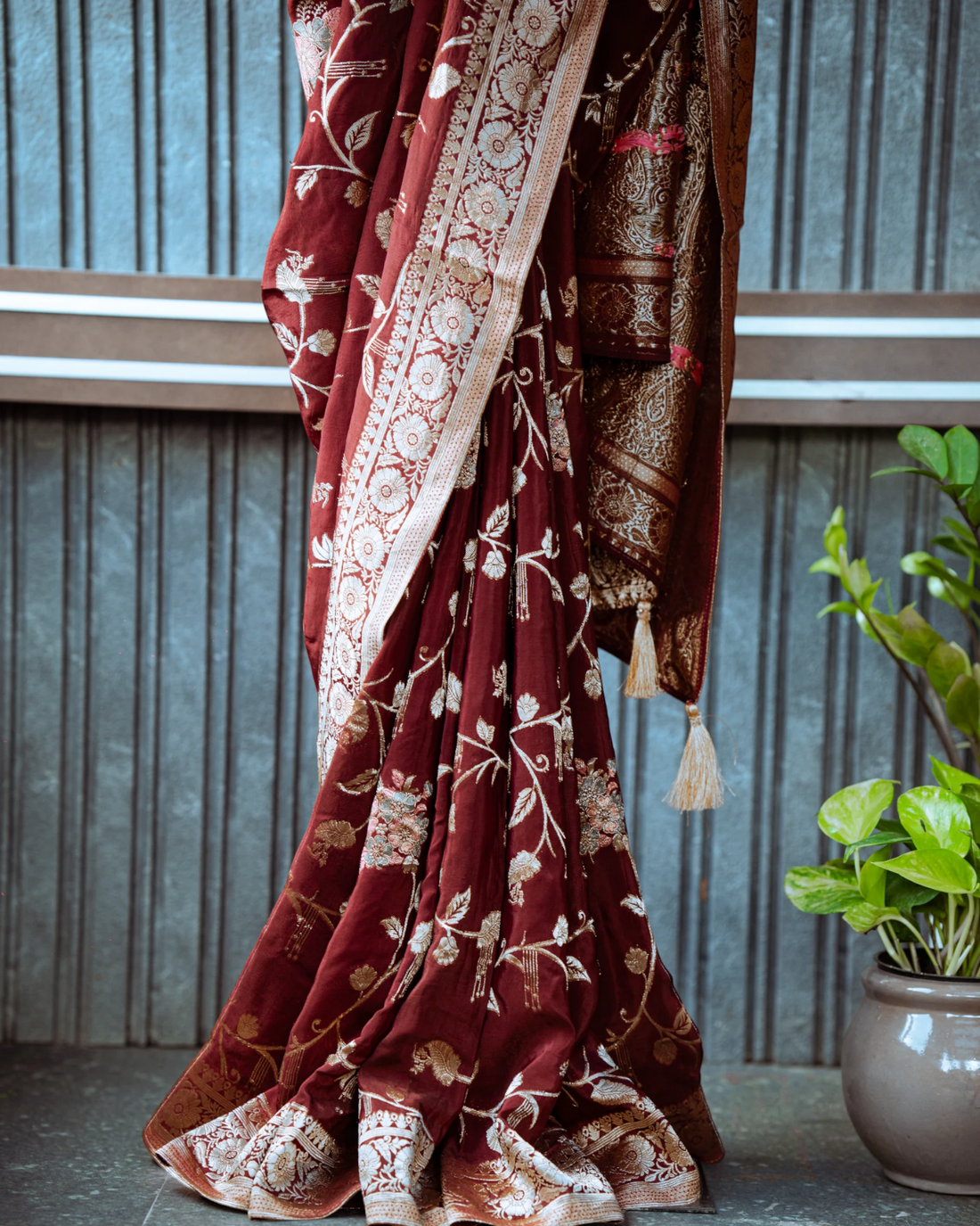 Look stunning and chic with our Maroon Nirvi Crepe Saree. Made from Banarasi crepe silk,...