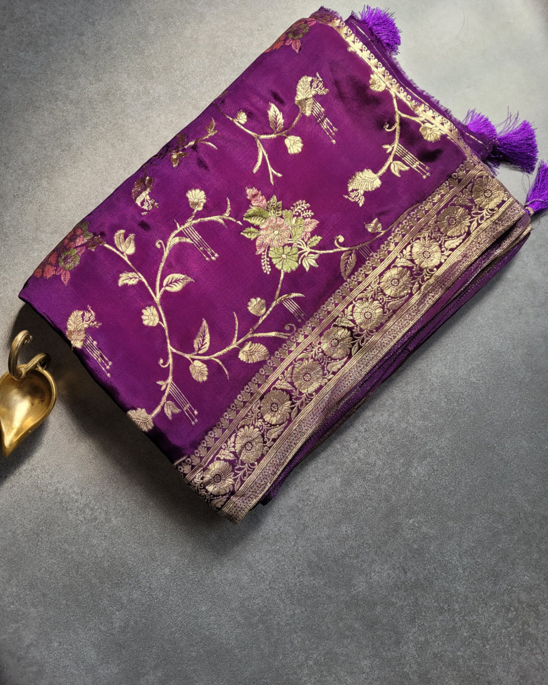 Step into timeless luxury with our Banarasi Satin Saree, a masterpiece that celebrates the grandeur...