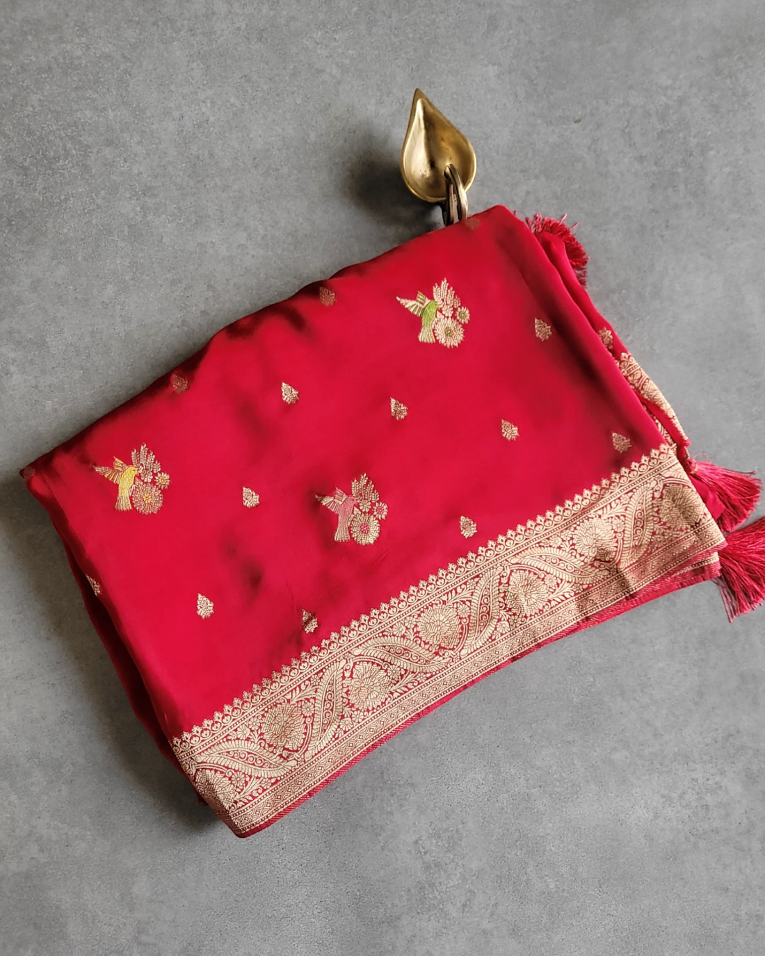 Look stunning and chic with our Banarasi Crepe Saree. Made from Banarasi crepe silk, this...