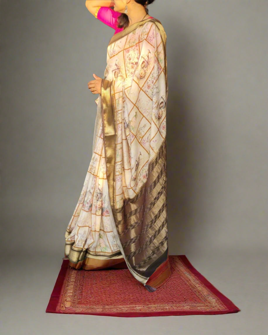 Fabric: Crafted from premium cotton fabric in offwhite with temple pattern on the borders Length: Standard...