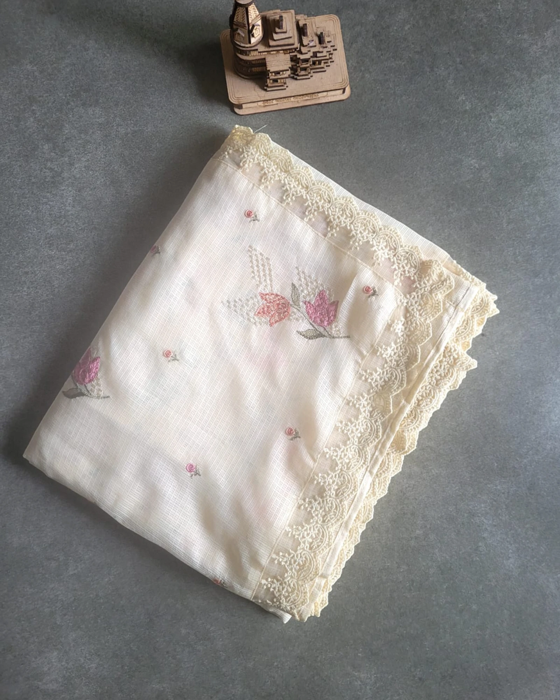 Fabric: Pure Kota Doria CottonLength: 5.5 meters (No blouse piece)Pallu: Light and breezy with embroidered...
