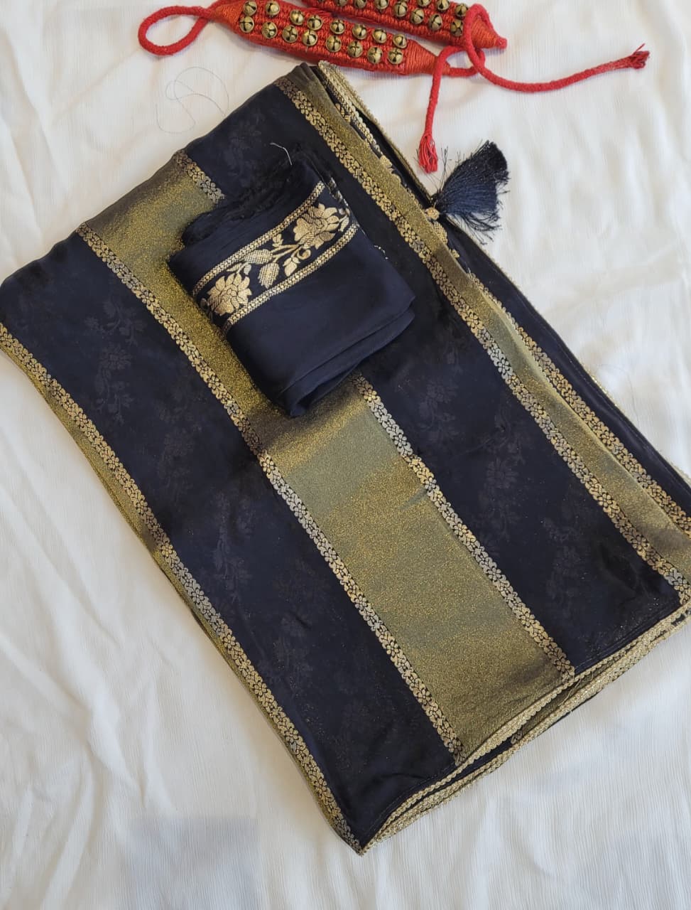 Look stunning and chic with our Banarasi Crepe Saree. Made from Banarasi crepe silk and Tissue stripes. This saree features intricate motifs and Tissue Silk Stripes that add a touch of elegance to your ensemble. Its festive look and bright color make it perfect for any occasion. Experience the luxury of traditional textiles with our saree. 6.25 meters in length including blouse.