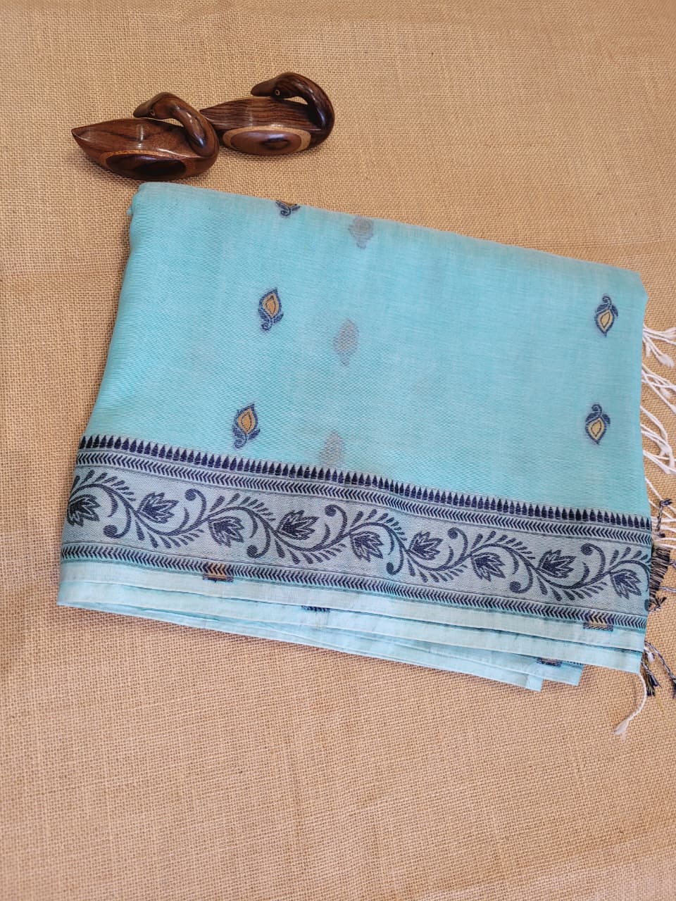 Woven by skillfully, this pure cotton saree is a celebration of timeless craftsmanship. The Jamdani weaving graces the body with delicate motifs, while the pallu carries richer patterns that reflect artistry. The mild border lends a hint of understated luxury, making it perfect for both daily wear occasions and intimate gatherings. The soft cotton drape ensures unmatched comfort throughout the day — a blend of heritage and grace in every fold.