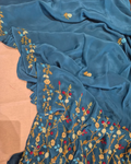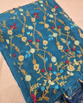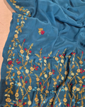 Style: A timeless drape crafted in crepe, known for its fluid texture and glossy finish. The saree is adorned with delicate hand embroidery, adding artisanal charm to its modern elegance. Easy to drape and effortless to carry, it’s perfect for both everyday sophistication and special occasions.