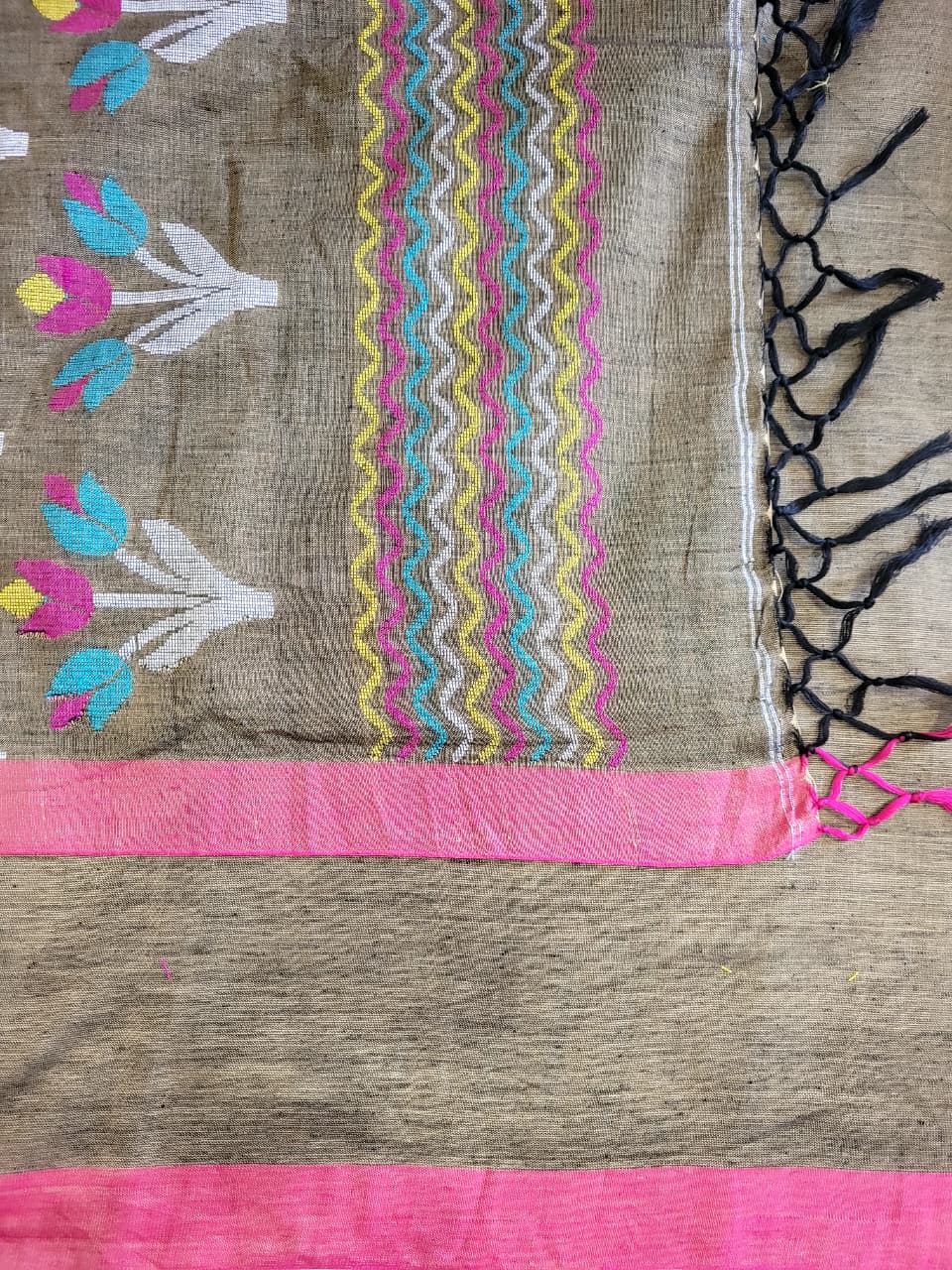 Pallu: Heavily woven with intricate Jamdani motifs and finished with elegant tassels