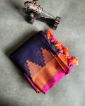 Pure Linen Saree with Temple Border & Contrast Blouse Crafted from 100% pure linen, this saree blends tradition with understated elegance. The body drapes effortlessly, offering a breathable, crisp feel that’s perfect for all-day wear. A classic temple border adds a touch of heritage, while soft tassels at the pallu give it a graceful, artisanal finish.