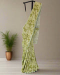 Unleash your inner fashionista with Chinnon Saree! Made with chinnon fabric with abstract prints, this saree features delicate lace and a modern applique on the plain blouse. With its free fall fabric and easy draping, you'll achieve a fresh, stylish look effortlessly.