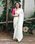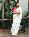 Experience elegance with this white pure linen saree, beautifully accented by a delicate zari border. The contrast color blouse and highlighted border add a striking touch, enhancing its timeless appeal. Crafted from breathable linen, it offers comfort while elevating your style for any special occasion.