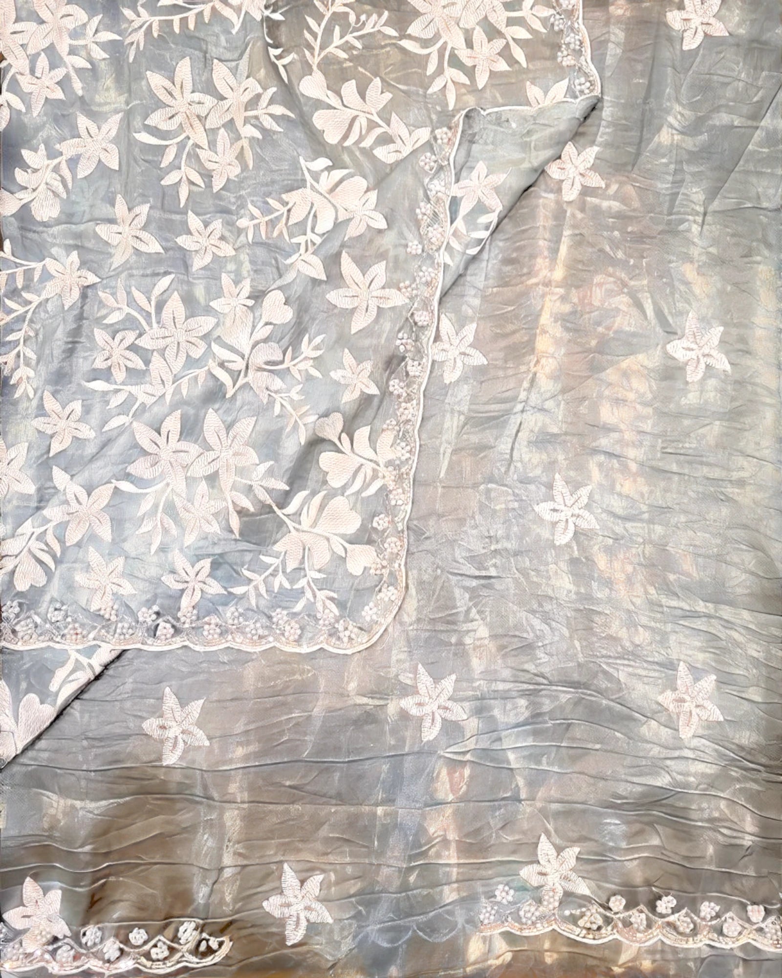The look is elevated with cutdana-detailed borders, where every saree carries its own unique pearl embroidery—making each piece one of a kind. Paired with a floral embroidered blouse, this ensemble brings together tradition and modern charm in the most graceful way.