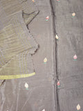 Style: A timeless drape crafted in crepe, known for its fluid texture and glossy finish. The saree is adorned with delicate embroidery, adding artisanal charm to its modern elegance. Easy to drape and effortless to carry, it’s perfect for both everyday sophistication and special occasions.