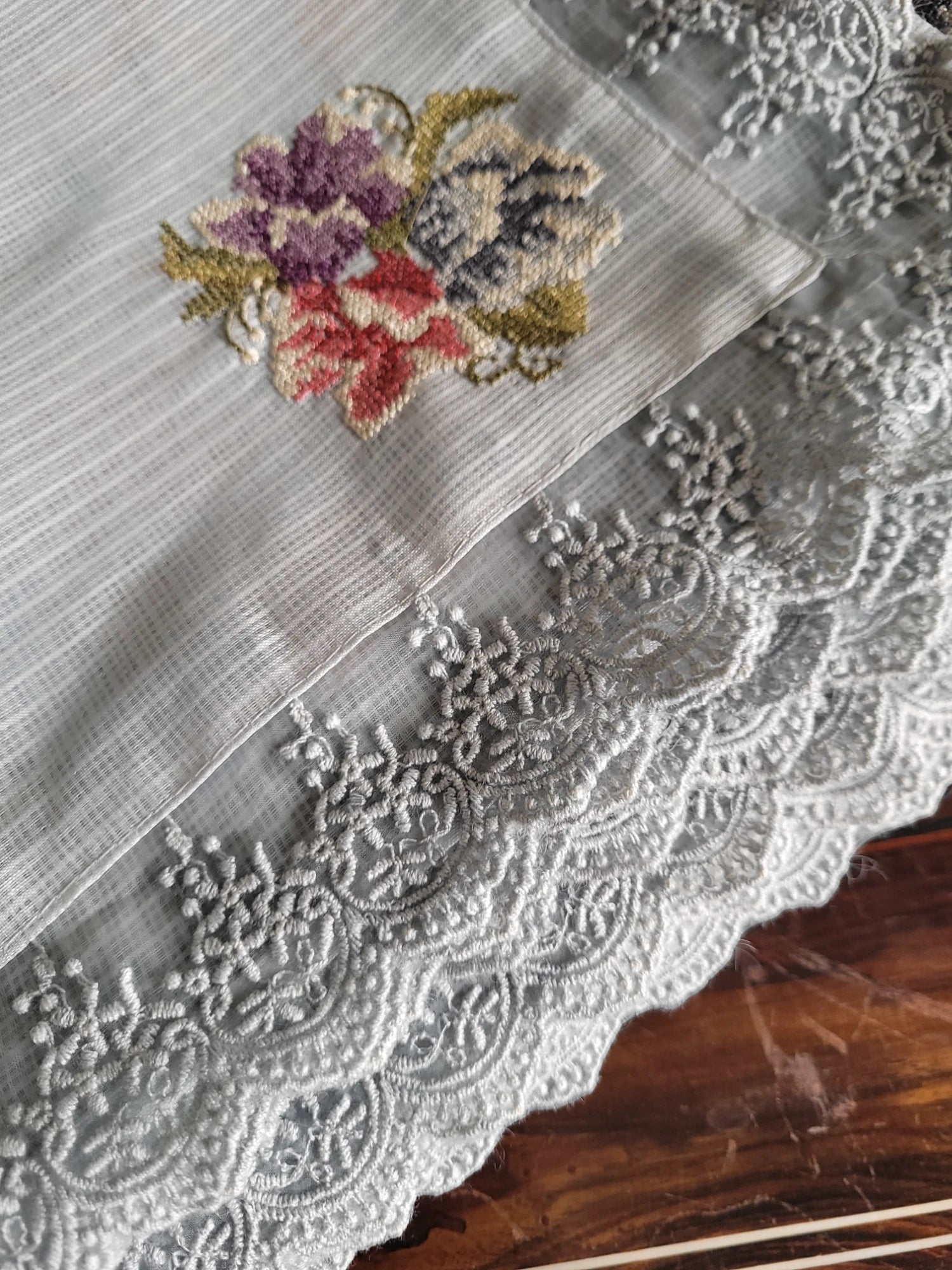 This airy Kota Doria saree features delicate embroidered motifs and a charming lace border, blending tradition with a soft, feminine touch. Lightweight and elegant — perfect for festive mornings, poojas, or a graceful everyday look.