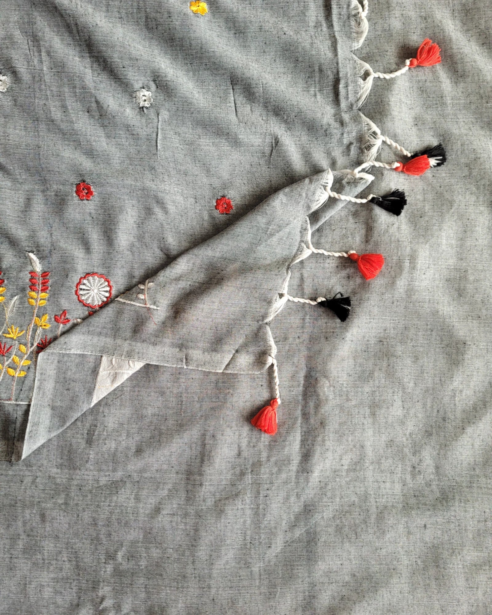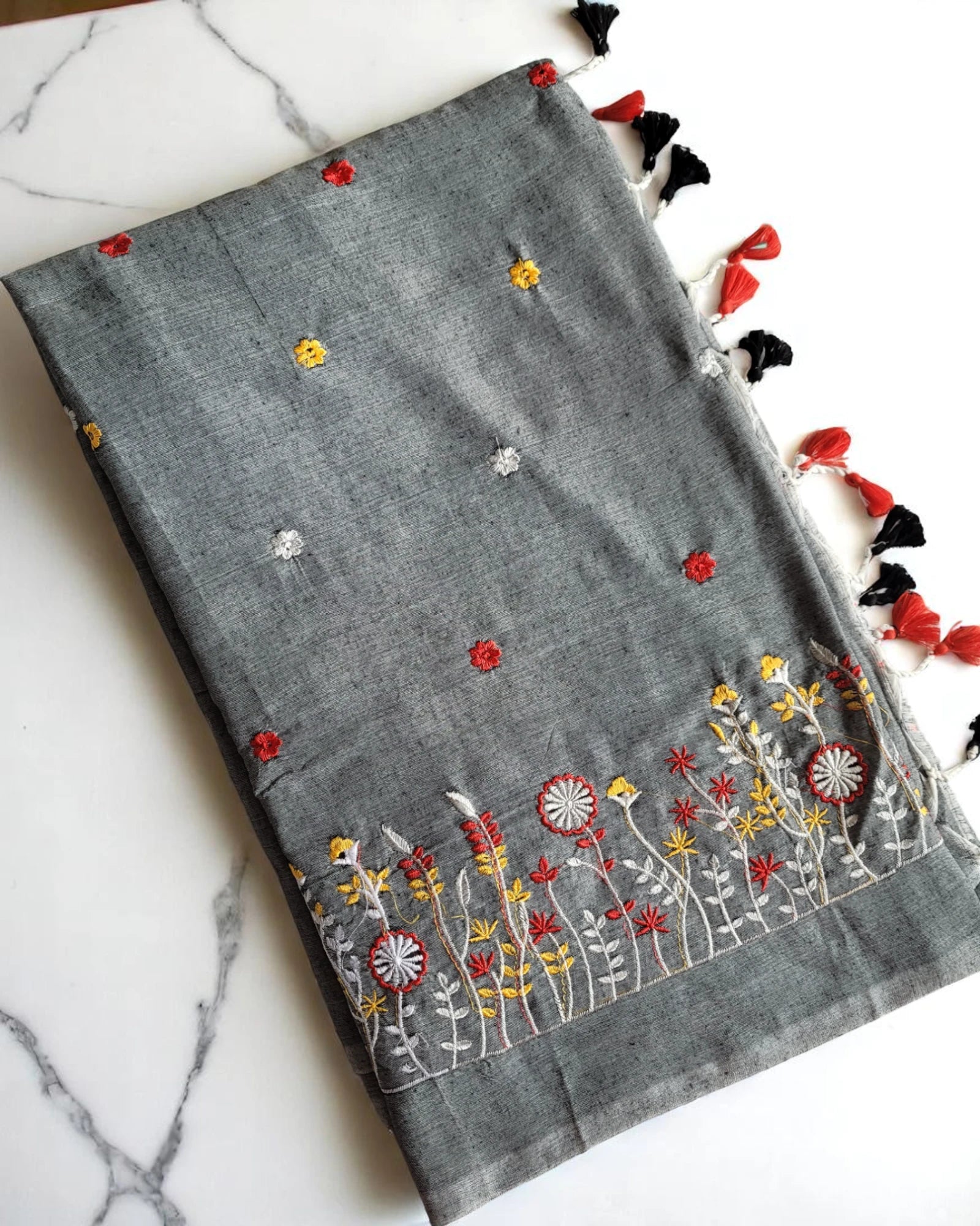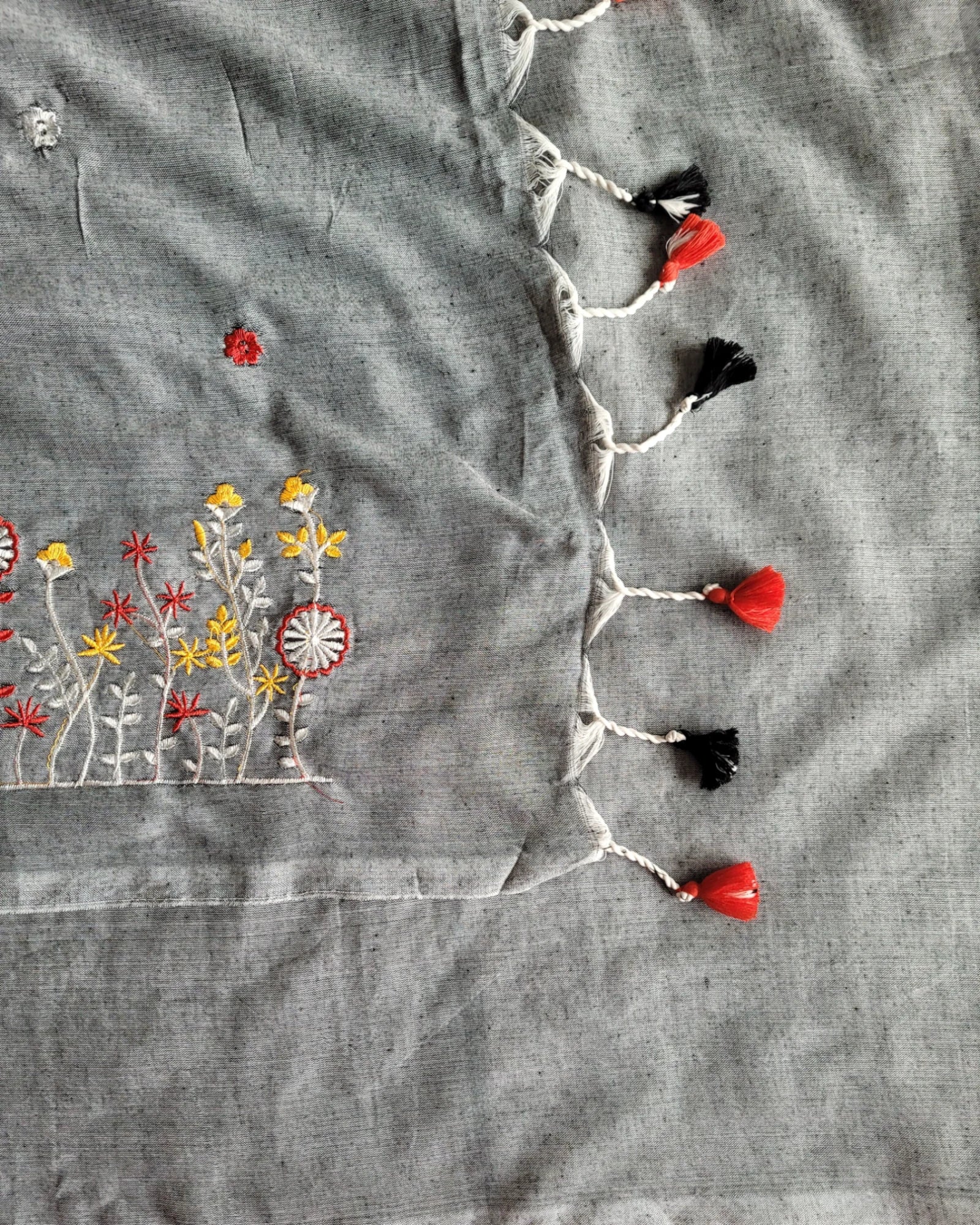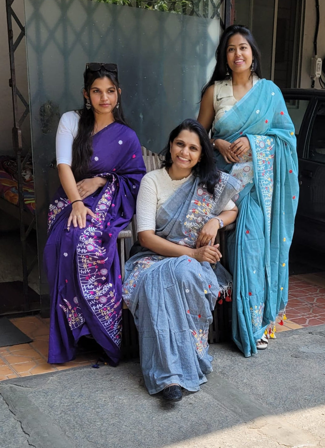 Style: A charming pink cotton saree adorned with delicate floral prints, bringing a touch of elegance to everyday wear. The border features intricate Kantha hand embroidery stitches with fine piping, adding a handcrafted appeal. The self-color blouse ensures a seamless look, making this saree a perfect blend of tradition and simplicity for work or casual wear.