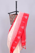 Style: Showcasing woven patterns in a offwhite and red color, this saree balances elegance and comfort effortlessly.