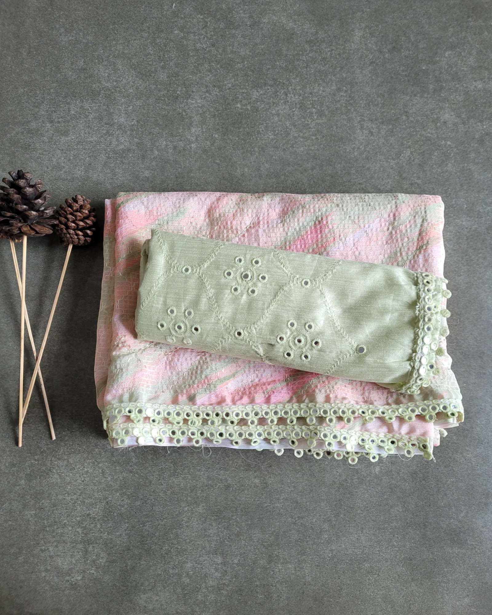 Unleash your inner fashionista with Chinnon Saree! Made with chinnon fabric with abstract prints, this saree features delicate lace and a modern applique on the plain blouse. With its free fall fabric and easy draping, you'll achieve a fresh, stylish look effortlessly.