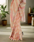 Unleash your inner fashionista with Chinnon Saree! Made with chinnon fabric with abstract prints, this saree features delicate lace and a modern applique on the plain blouse. With its free fall fabric and easy draping, you'll achieve a fresh, stylish look effortlessly.
