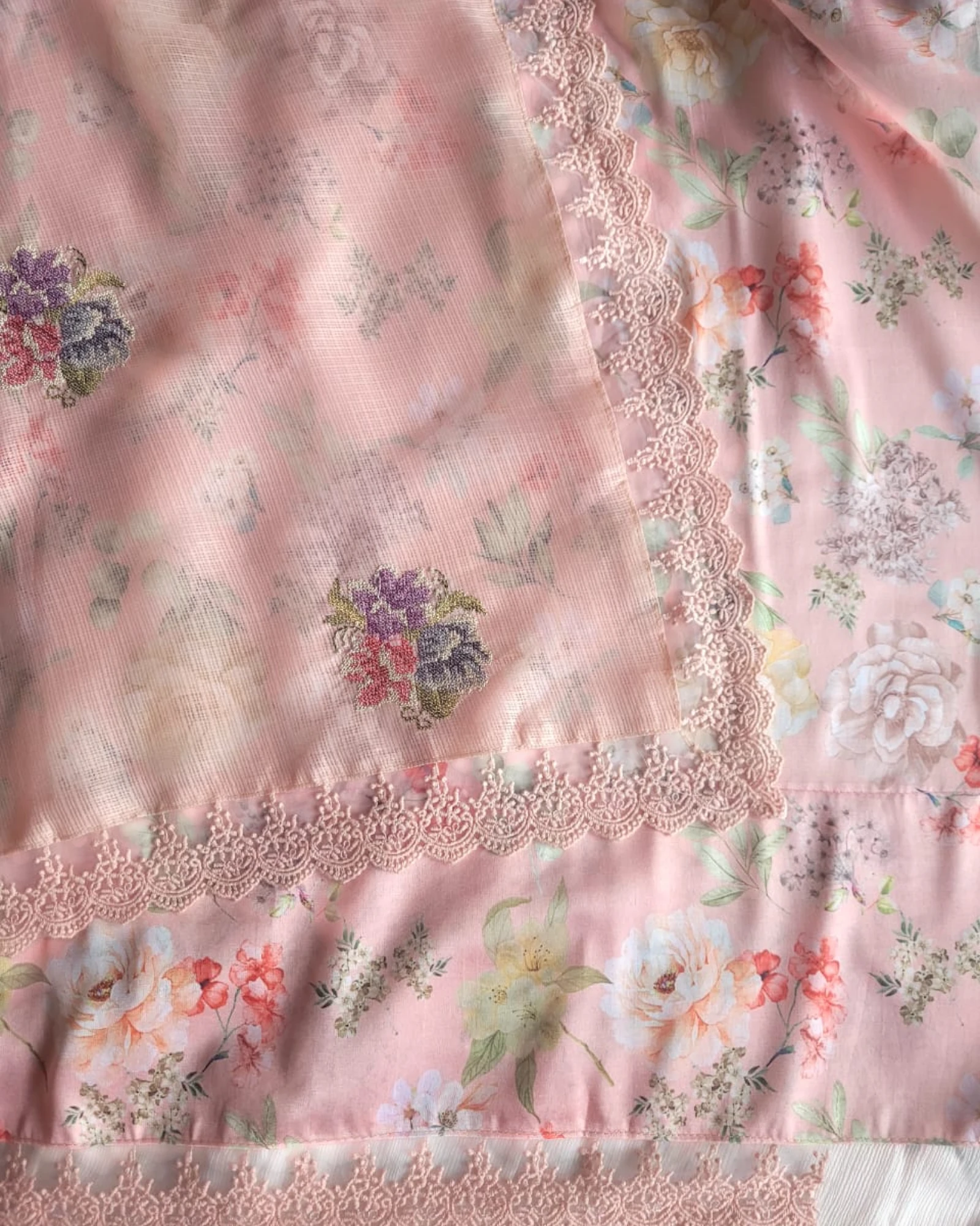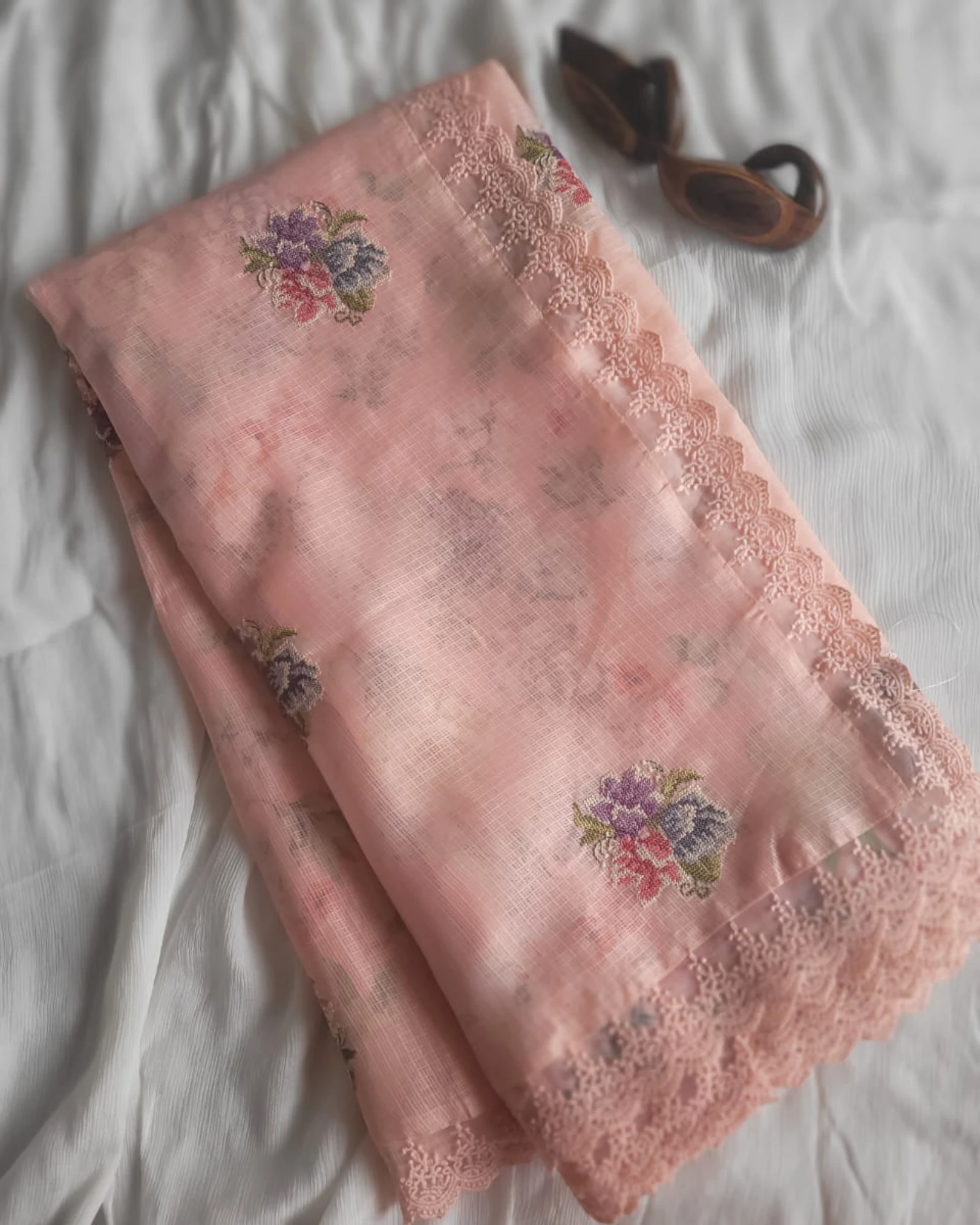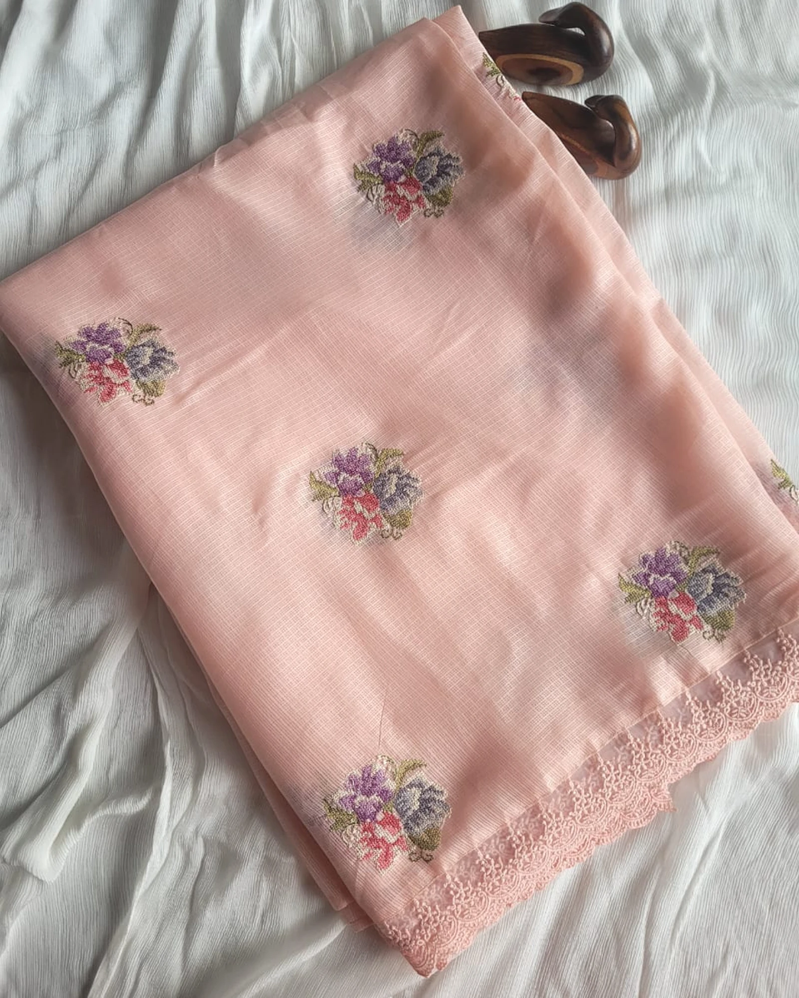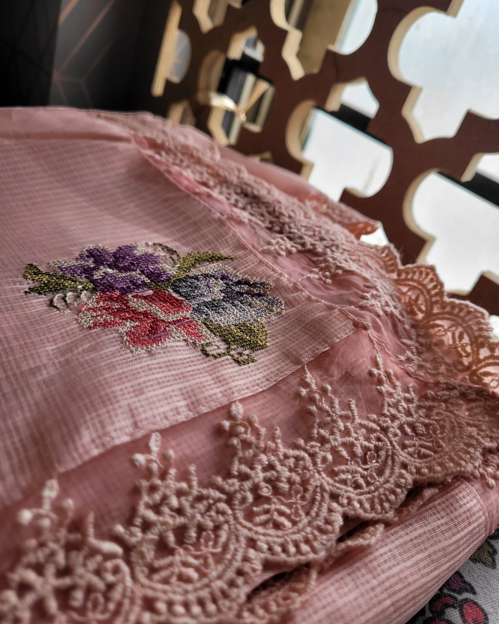 This airy Kota Doria saree features delicate embroidered motifs and a charming lace border, blending tradition with a soft, feminine touch. Lightweight and elegant — perfect for festive mornings, poojas, or a graceful everyday look.