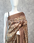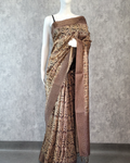 Style: An almost-brown digital-printed saree with a graceful drape, enhanced by a zari border for a hint of tradition. The subtly shiny fabric gives it an elegant charm, making it perfect for work, casual outings, or evening gatherings. The rich brocade blouse adds a refined contrast, elevating the overall look.