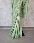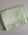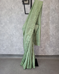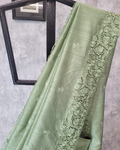 Style: A breezy pista green Tussar saree that drapes effortlessly, offering comfort and elegance in equal measure. Its lightweight nature makes it easy to wear and carry, perfect for long workdays or casual gatherings. The soft texture and muted sheen add a refined charm, making it a versatile addition to your wardrobe.