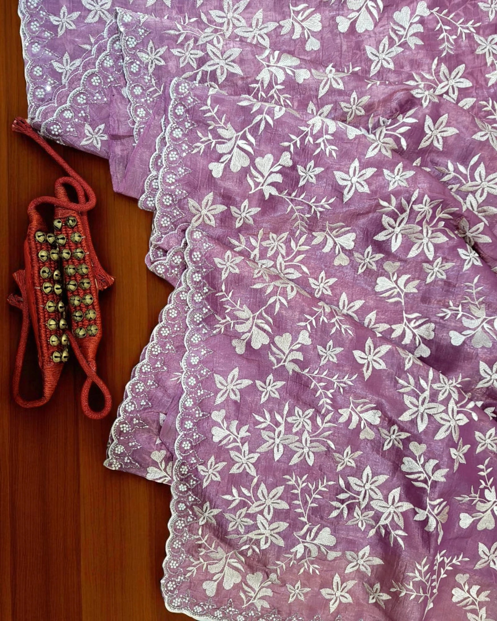 The look is elevated with cutdana-detailed borders, where every saree carries its own unique pearl embroidery—making each piece one of a kind. Paired with a floral embroidered blouse, this ensemble brings together tradition and modern charm in the most graceful way.