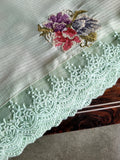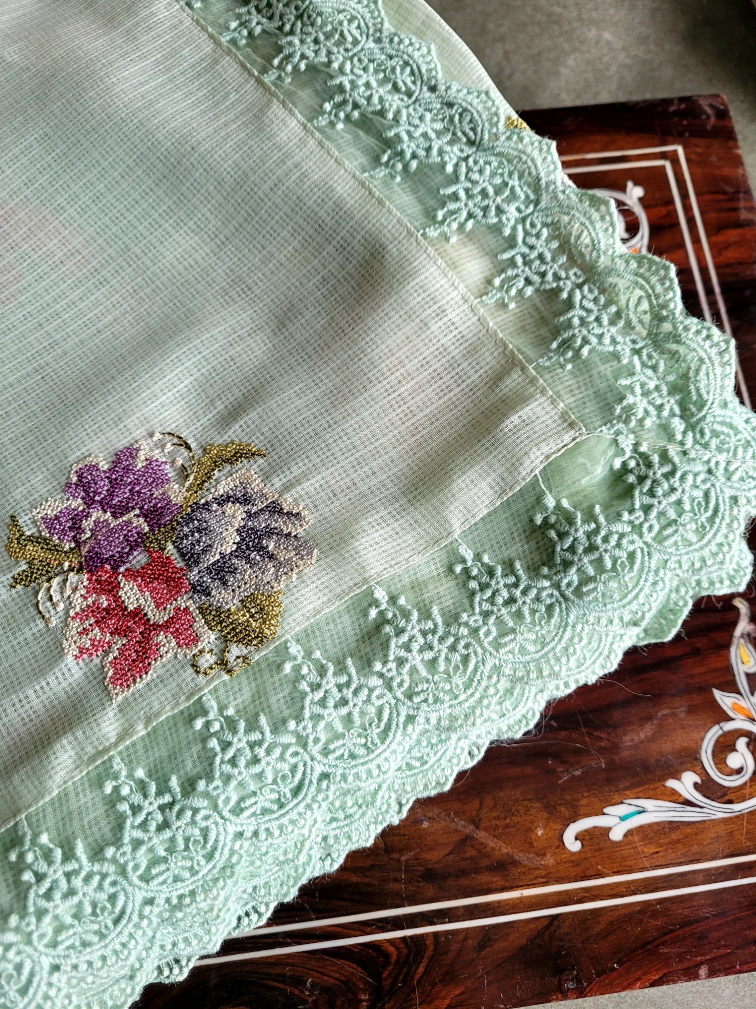 This airy Kota Doria saree features delicate embroidered motifs and a charming lace border, blending tradition with a soft, feminine touch. Lightweight and elegant — perfect for festive mornings, poojas, or a graceful everyday look.