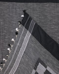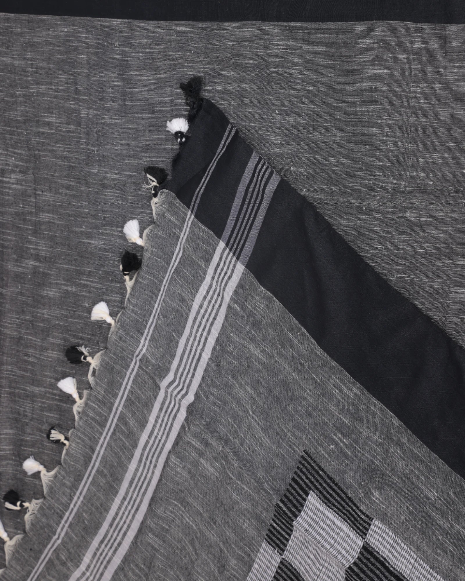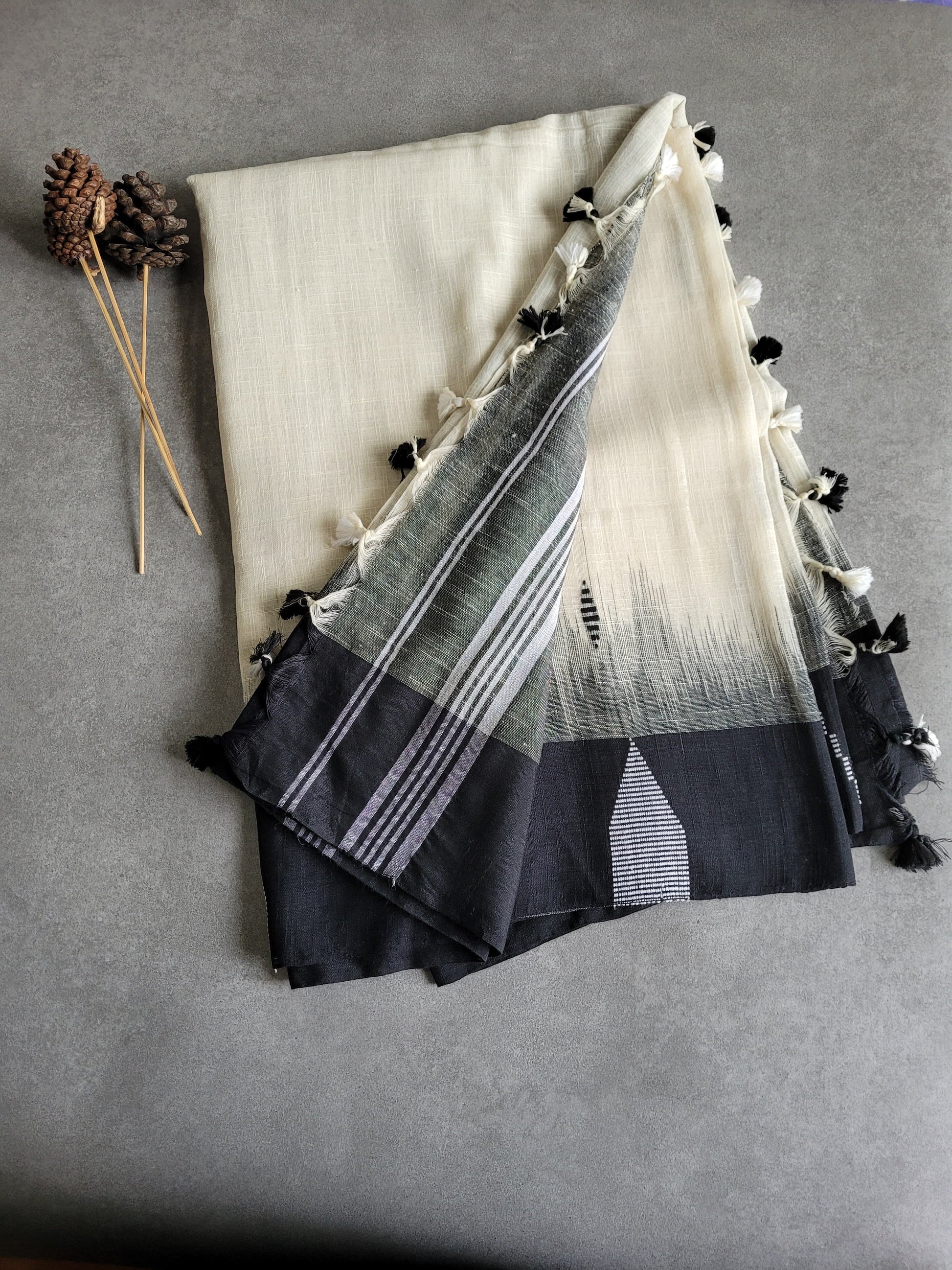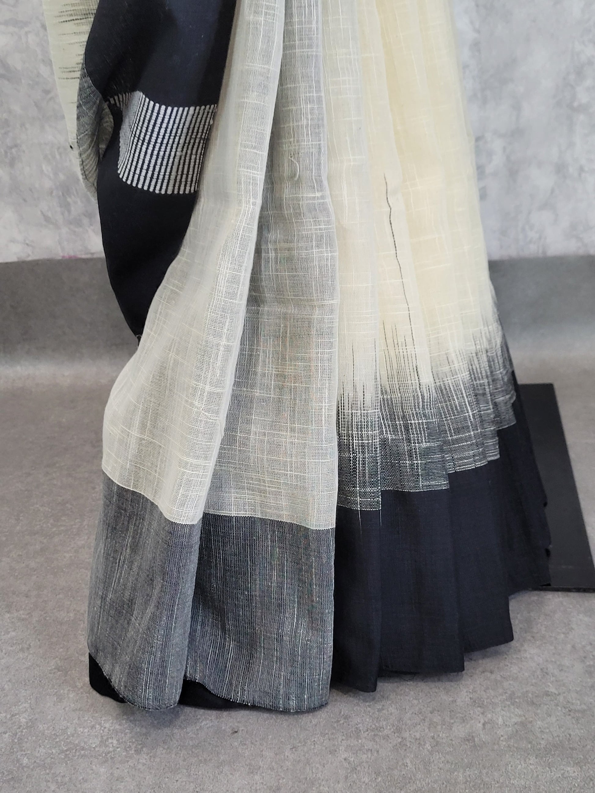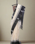 Style: Showcasing woven patterns in a offwhite and black color, this saree balances elegance and comfort effortlessly.