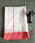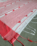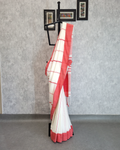 Body: white saree with a vibrant red border, adorned with kantha stitch work all over, showcasing traditional craftsmanship.
