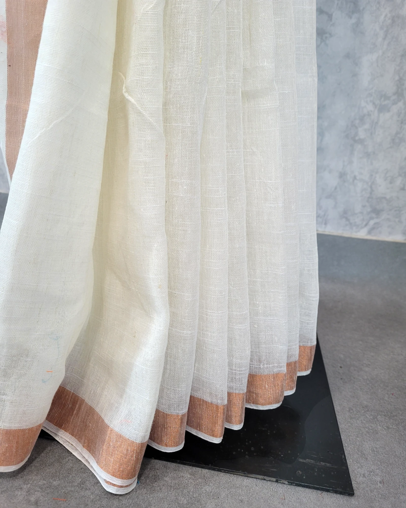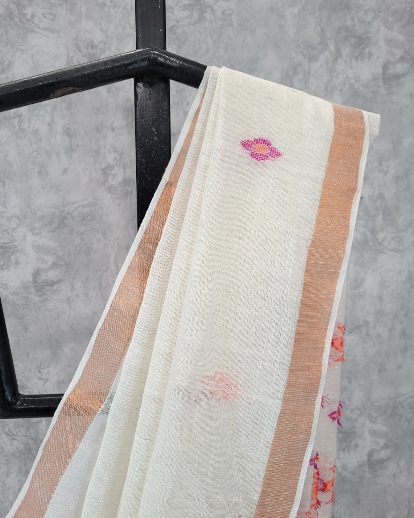 Style: Adorned with intricate weaving buttas, this saree blends tradition with modern sophistication. The soft linen drapes gracefully, making it perfect for workwear, casual outings, or special occasions.