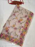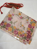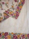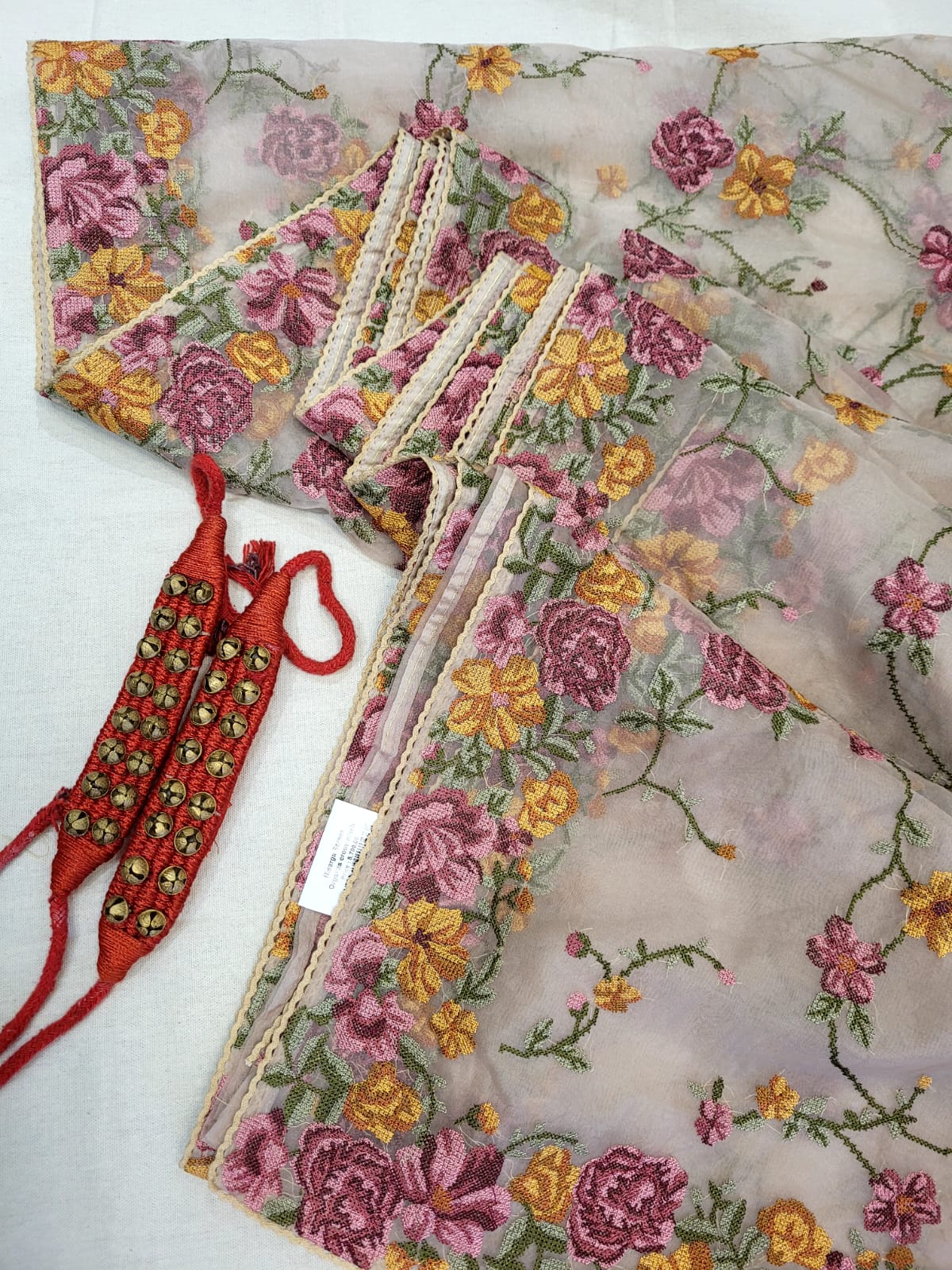 Style: A dreamy crushed organza saree, richly decorated with multicolor cross-stitched embroidery on the borders, pallu, and body. The elegant scallop edging at the borders adds a refined finish, making it a perfect choice for celebrations and special occasions.