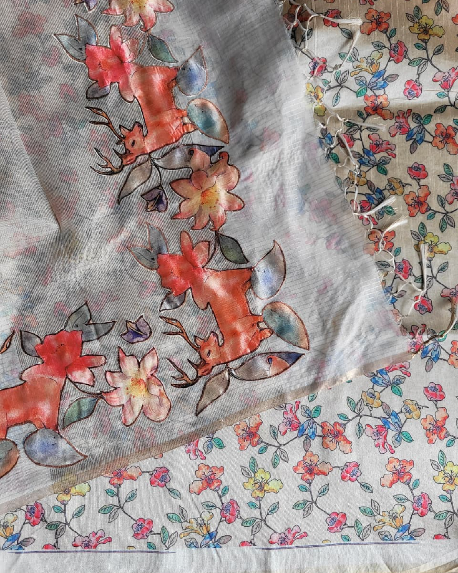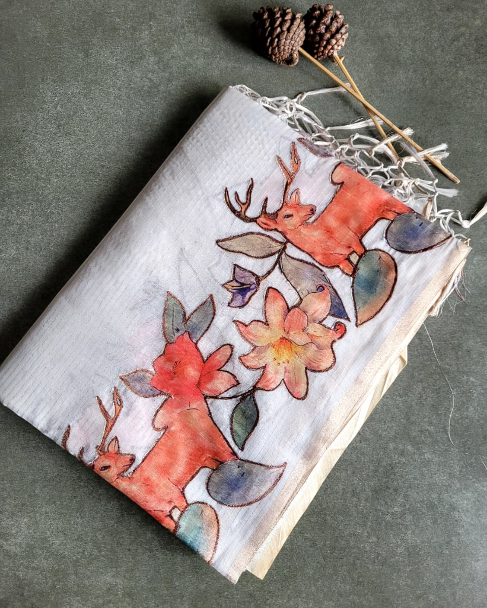 Crafted from soft semi tussar fabric, this saree blends the charm of traditional texture with the ease of modern wear. The subtle sheen of tussar highlights the intricate appliqué work, creating a beautiful interplay of texture and design. Paired with a printed contrast blouse, it adds a touch of vibrance and individuality. Lightweight and easy to drape, this saree is perfect for days when you want to look graceful without compromising on comfort.