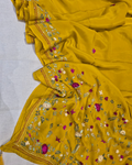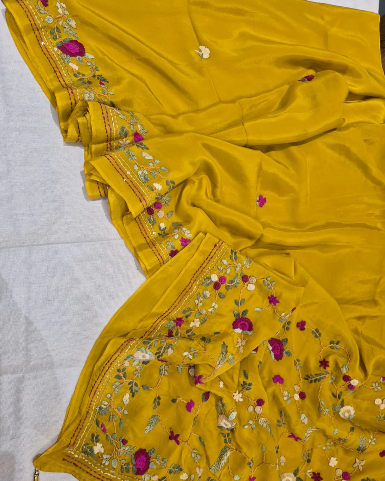 Style: A timeless drape crafted in crepe, known for its fluid texture and glossy finish. The saree is adorned with delicate hand embroidery, adding artisanal charm to its modern elegance. Easy to drape and effortless to carry, it’s perfect for both everyday sophistication and special occasions.