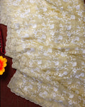 A saree that speaks the language of art and elegance. Crafted in lightweight crepe organza, this drape flows with effortless grace, making it a dream to wear from morning to evening. Intricate floral embroidery blooms across the body of the saree, celebrating Indian heritage with a delicate hand.